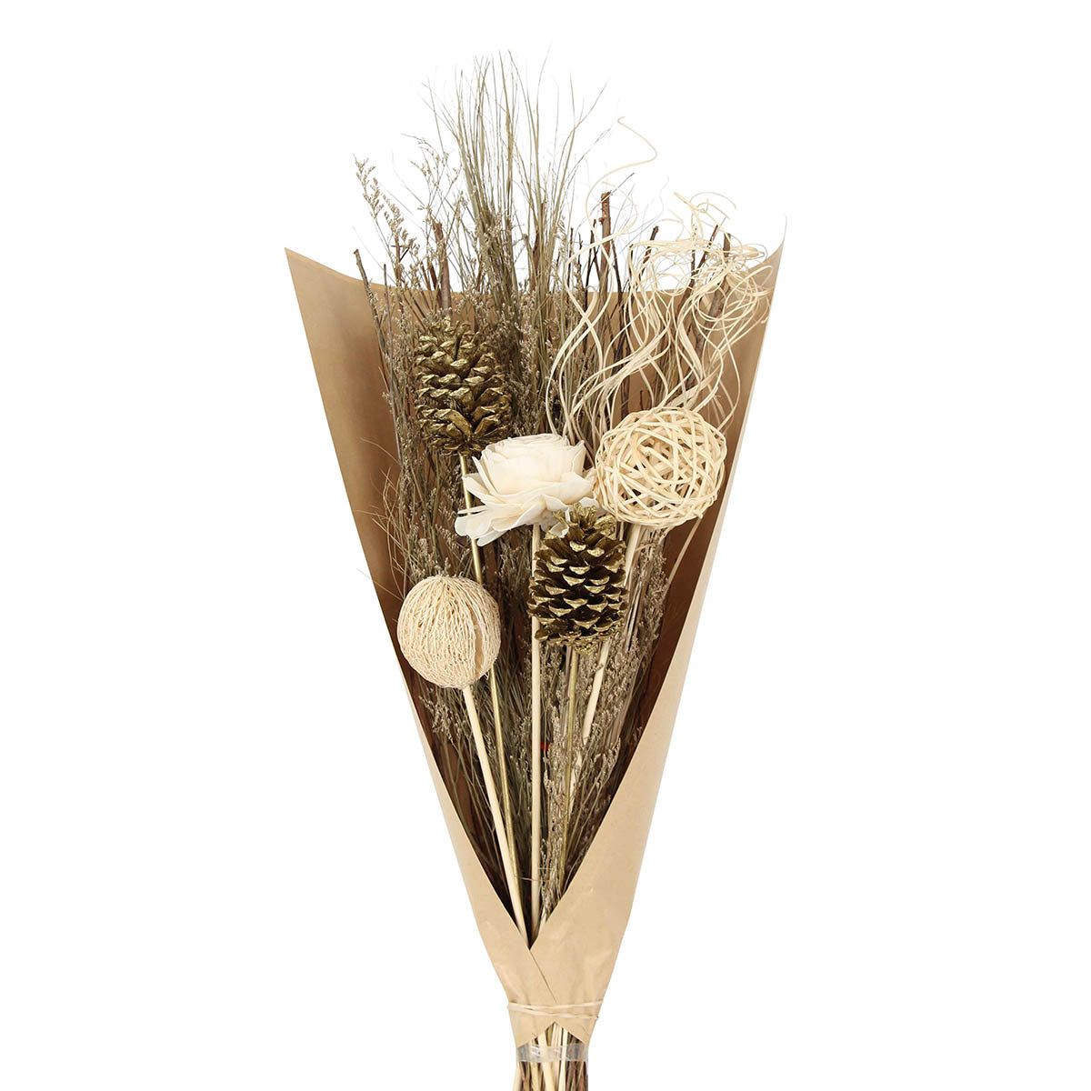 Crafted with pine cones and sola skin beauty roses, this bouquet is perfect for adding a special touch to your winter decor. Use it to adorn your space and create a festive atmosphere.