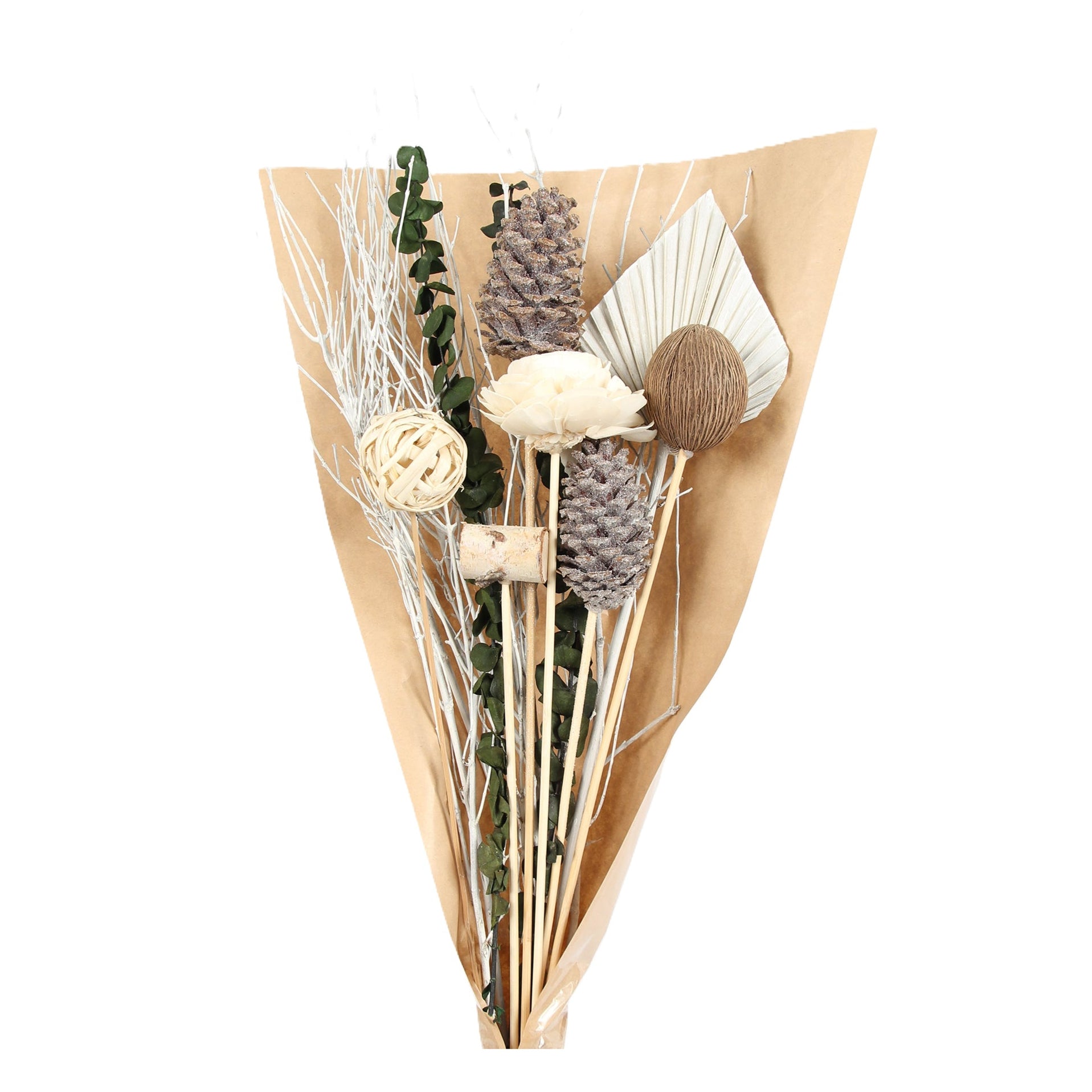 Crafted with frosty accents and dried elements, this bouquet brings the serene beauty of winter. Use it to decorate vases or homes.