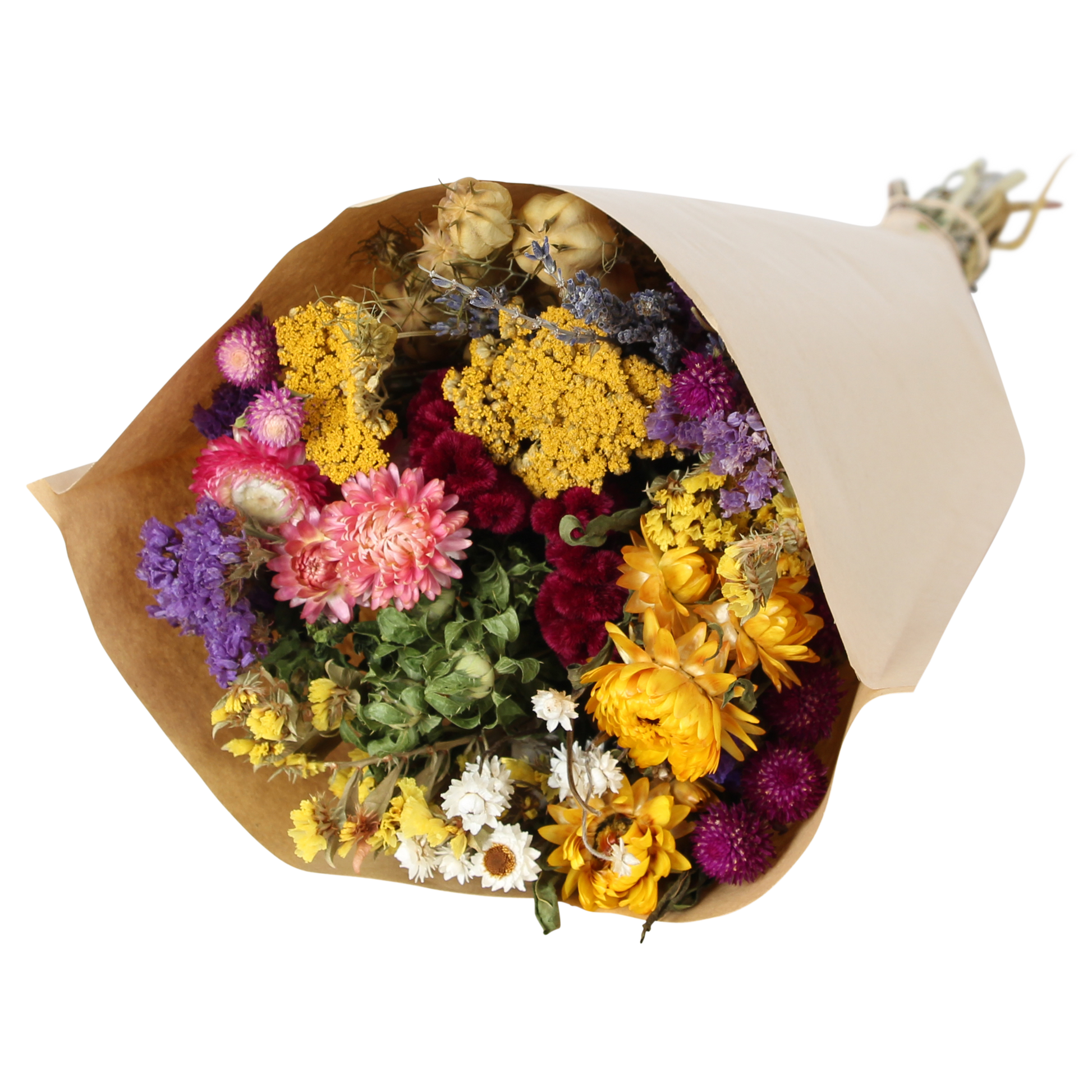 Crafted with a vibrant array of blooms including yarrow and helichrysum, this bouquet elevates your decor with natural charm. Perfect for vases or urns.